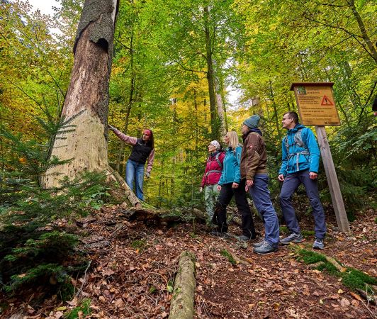 Der Urwaldsteig ist nicht markiert und ohne Begleitung nur schwer zu finden. Deshalb lohnt es sich, einem erfahrenen Waldführer zu folgen und dabei faszinierende Einblicke in die unterschiedlichsten Entwicklungsstadien unserer Wälder zu bekommen. Der Weg führt durch die Johannisruh vorbei an imposanten Felsblöcken zu einem Aussichtspunkt mit herrlichem Blick auf den Großen Arber.