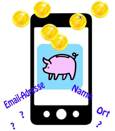 Illustration eines Smartphones auf dessen Bildschirm ein Sparschwein zu sehen ist. In das Schwein fallen Geldstücke, um die Szene herum "fliegen" Wörter wie "E-Mail-Adresse?" , "Name?", ...